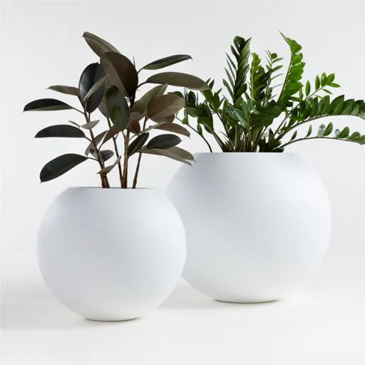 A nearly spherical planter showcases tall corn plants and overflowing Boston ferns indoors or out, its white finish contrasting brightly with the lush greenery. Thanks to a judicious addition of cement, the fiberglass planter offers the beauty of a concrete planter without the weight. A rubber stopper in the drainage hole gives you options, allowing you to plant directly or simply pop in potted plants. Our small white planter, a Crate and Barrel exclusive, pairs with its larger counterpart for a tiered display.