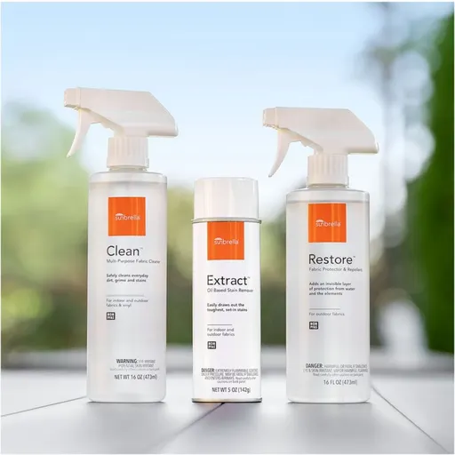 Maintain, protect and restore your outdoor cushions, pillows and umbrella canopies with this comprehensive care kit developed by the outdoor fabric specialists at Sunbrella. Use Clean as a multipurpose solution to keep fabrics looking and performing their best. For tough, oil-based stains, Extract is an easy spray-on solution. For fabrics that have seen a season or two, use Restore to protect and renew water repellency.