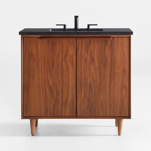 Go ahead and make that bath remodel happen with our Tate vanity—no demolitions or big budgets needed. Easy to install and built to last, the single-sink bathroom vanity transforms your space with timeless mid-century style. The sleek design showcases the gorgeous grain of walnut veneer with retro-leaning horizontal pulls and conical legs. A honed black granite top provides color and material contrast as well as a rectangular cutout for the white ceramic undermount sink. The cabinet contains a single adjustable shelf, and pre-drilled holes accommodate a standard 8" widespread faucet (not included). Take your bathroom update one step further with our hardware collection of hooks, towel racks and toilet paper roll holders in six contemporary styles with four finish options.