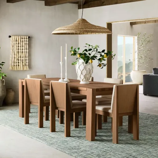 Crafted of solid white oak with a warm brown finish applied by hand, our Terra dining chair celebrates the rustic beauty of wood. The chair's dynamic, angular look features square legs that extend to the top of the wood panel back. Clean-tailored seat and back cushions upholstered in a cotton-blend ensure a comfortable stay. For a coordinated kitchen or dining room, pair the chairs with our warm brown Terra dining table.