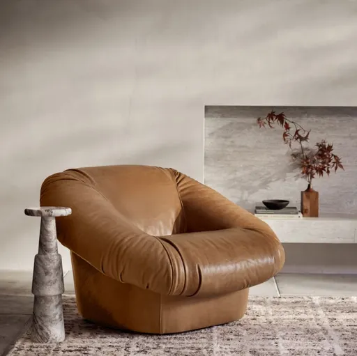Incorporating the plush, oversized exuberance of 1970s Brazilian design, our Topanga accent chair makes a retro-chic statement with over-the-top comfort. The voluminous padded seat sits low and loungey, with medium support provided by the best-of-both-worlds combo of supportive foam and soft polyfiber. The buttery soft leather upholstery is tailored with a unique combination of gathers, wrinkles and puckers that makes each chair one of a kind. The neat, squared off base provides clean-lined contrast as well as the playful functionality of a 360-degree swivel that makes this relaxing chair doubly inviting.