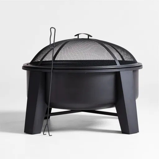 Our clean-lined Torin fire pit puts the focus on dancing flames, charming crackling sounds and aromatic ambiance. Perfect year round for warding off chills and creating warm ambiance, the black-finished steel fireplace has a bucket design for burning logs. Broad angled legs and a cross-bar base add stability along with eye-catching style. Each fire pit includes a spark screen, poker, grate and a vinyl cover.
