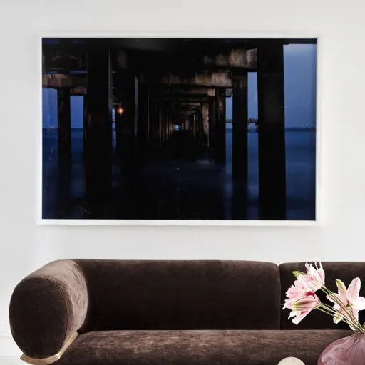 Artist EJ Camp brings mystery and mood to California's famed Santa Monica Pier exposing the attraction's underlying structure. Photographed under the waning light of dusk, the image favors the silhouetted supports, detail-effacing shadows and deep tonal blues over the topside hustle and bustle. Each giclee print of the original image is reproduced on photographic paper and presented under clear acrylic in a matte white-finished wood shadowbox frame.