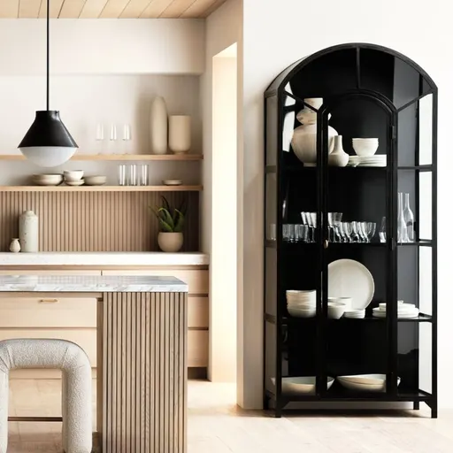 Ventana's Old World arch, contemporary zinc-colored iron construction and light-reflecting glass panes and black-painted shelves put on quite a display in the library or living room. Exquisitely crafted, the dramatically scaled glass display cabinet is welded by hand with welding marks left on view attesting to its fine workmanship.