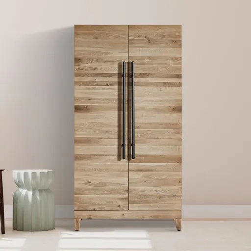 Rich with the varied textures and tones of oak, our Wallace bar cabinet graces rooms with its stately presence and generous bar-service storage. The clean-lined cabinet devotes its flat front doors to vertical slats of oak that display graining and knots unique to each piece. Inside, the cabinet reveals a wealth of storage options, including two drawers, a clear glass shelf, bottle and stemware racks, a mirrored glass back panel and four wood-railed shelves on each door. A black glass work surface and ambient lighting that turns on when the doors open add to the bar cabinet's sparkling interior.