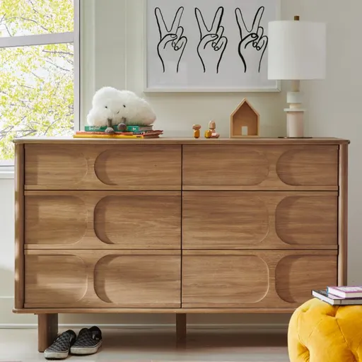 Our Wes collection furnishes your kid's nursery or bedroom with a unique mix of soft, organic curves and bold geometric details in natural poplar and oak. The Wes Six-Drawer Wood Dresser provides beautiful and practical storage for clothes and more. Majorly mod cutouts create hidden handles for six roomy drawers that keep essentials organized and out of sight. Finished with soft edges, this storage essential is elevated on oversized dowel legs, our Wes Six-Drawer Wood Dresser.