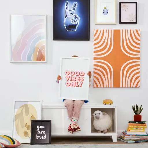 And don't you forget it! Our framed wall art scripts out "you are loved" in lightly looping cursive, the white type juxtaposing a deep black ground. From baby's nursery to big-kid rooms and shared family spaces, this ever-important reminder brings a meaningful message to little ones' fave places (especially if their love language is words of affirmation!). A Crate & Kids exclusive, this modern print comes ready to hang in a matte black frame.