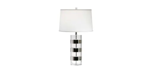 The artisans who created this sophisticated lamp for us started out making brass pots and urns in Hong Kong. It’s clear that over the years they have perfected the marriage of metal and crystal. The Asher is deco-inspired yet conversant with many different design styles. Its clear crystal column is adorned simply with three wide polished nickel or brass finished bands and topped with an off-white linen shade.