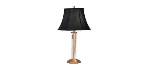 Elegant table lamp with hexagonal base that nests 6 vertical glass rods and a polished brass post. Frame crafted from steel and glass. Clear glass rods with brushed brass base. Your choice of a black or off white soft back linen bell shade, self tape. Uses two 8.8-watt LED bulbs; pull chain on/off.