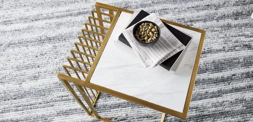 The Battson modern pullup table combines everyday function with uncommon fashion. It's a C-shaped accent table, with a steel base finished in brass that has an airy, open design, topped by an elegant white marble insert. This portable marble and brass-finish end table is handy for snacks and drinks when you're entertaining family and friends. It's also a great place to park your popcorn when you're treating yourself to a quiet movie night.