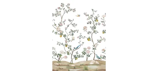 Delicate modern chinoiserie by artist Daisy Bennett. Printed on grasscloth. Comes in two 34" repeatable panels. Non-woven substrate. This product is artisanal in nature, so no panel will be identical. You may notice slight differences in weave or subtle color variations, all part of owning a one-of-a-kind product. Roll width: 34", length: 90". About 42.5 sq. ft. per roll. Not recommended for use in wet, damp, or humid spaces. Made in China, printed in the United States; meets Ethan Allen's standards and specifications. This product is not washable. Cleaning should be done by lightly vacuuming with a vacuum brush.