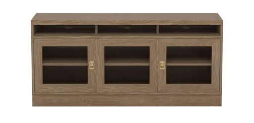 Streamline your streaming look: Place your TV atop our 60" Callum modern media cabinet. With three roomy, vented tempered glass-door cabinets for storing your game consoles and more, plus brass-plated hardware inspired by British campaign style.