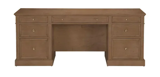 Double-pedestal desk with seven drawers. Part of our Continental modular home office. Crafted from maple. Drop-down back panel for wire management system that directs cords to equipment and outlets with minimal visibility. Each pedestal includes three side drawers, with a single file drawer that can accommodate both letter- and legal-sized folders. Applied beveled molding around outside edge of drawer fronts. Decorative hardware in one of three finishes: Antique Brass, Blackened Pewter, or Burnished Nickel. Designed for use with any small or large Continental base cabinets, including file and open printer cabinets. Can also be freestanding. Furniture tip-over can cause serious injuries. Please use the tip-restraint kit included with this item. Easy-to-use levelers ensure stability, even on uneven floors. Additional finishes are available for order in Design Centers. Crafted in North America by Ethan Allen artisans.
