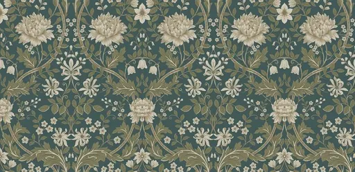 Mixed flowers bloom symmetrically atop this floral wallpaper's navy background. Each ivory bud is highlighted and shaded to create a hint of realism in a geometric arrangement that brings visual peace to any room.