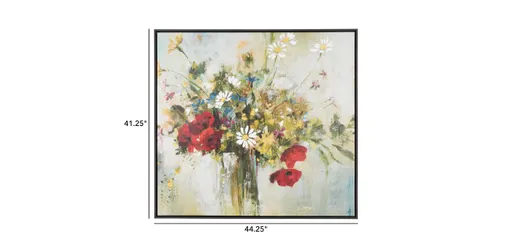 Eye-catching ruby and vibrant gold are beautifully balanced by touches of cool blues and greens. The artist's impression of a still-life bouquet painting leans abstract, making it a perfect addition to modern formal rooms or bright casual spaces.