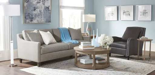Crafted from knotty oak solids and veneers. Textured rustic tabletop: layered offset planks, hand-sanded saw marks, artful hand-distressing, small unfilled knots, antiquing. Each planked tabletop is unique: variations in natural markings, coloration, and distressing are expected. Fixed lower shelf. Available in an array of custom oak finishes. Made in the U.S. by Ethan Allen artisans. Product weight: 11 lbs.