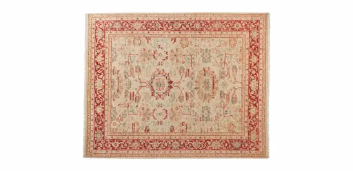 The classic design elements in our Isaiah Hand-Knotted Rug are timeless but modern enough for today’s decor. It's skillfully crafted of tricolor yarns in warm red and cream tones, creating a striated finish that enhances the depth of the design's patterns.