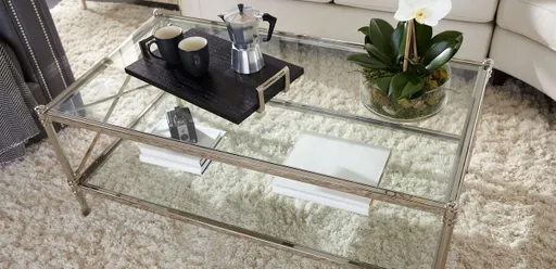 Bring a touch of Old Hollywood sparkle into the center of your living room. Artisan-crafted from steel and finished in either nickel or bronze, our Jocelyn coffee table has a sweeping X motif on either side and a lower glass shelf for storage and display.