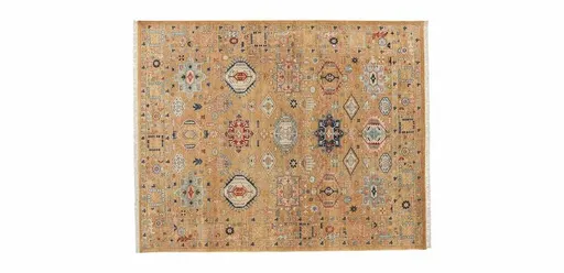 Globally appealing area rug inspired by indigenous patterns. Hand-knotted from 100% Ghazni wool. Persian-style knot with tea-stained fringed edges. Very low pile with antique wash.