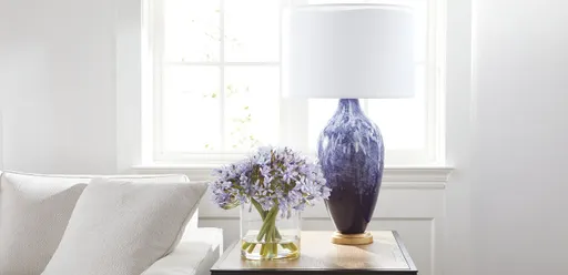 Our blue Milo table lamp is a work of art defined by its vivid one-of-a-kind drip pattern, created when artisans carefully glaze each fixture—no two are alike. The glazed base is set atop a wood base painted in a champagne color.