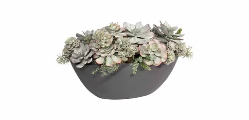 * Large mixed succulents in an oval planter crafted from dark gray resin