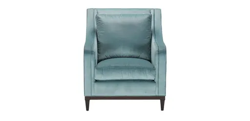 A modern club chair that features sloped arms, loose cushions, and a sleek exposed wood base. Removable base. Tailored by hand over a durable engineered panel frame. Poly-wrapped foam and fiber cushions provide a soft, structured seat. Base finished in Raisin (939), a rich, cool brown water-based finish. Additional options like nailhead trim and contrast welting, plus hundreds of additional fabrics, are available in Design Centers. Pairs with the Odell Sofa. Also available in leather.