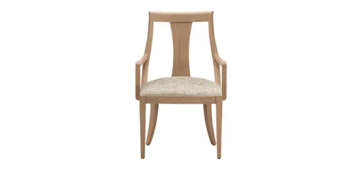 The Paulson dining armchair mixes the sophistication of Hollywood Regency style with a simplified silhouette for transitional styling. The back that gently slopes into high-set arms—the scroll detail along the top is an elegant touch—and the gently curved front legs create a distinctive form. This chair can be dressed up or down depending on your fabric or leather and wood finish choice.