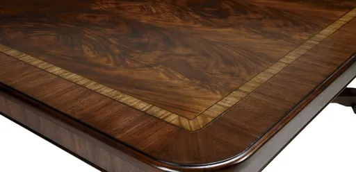 Doubly distinctive with two pedestals and two 20-inch leaves, the substantial Sanders steals the spotlight in any dining room or library. Traditional, clean lines are complemented with a luxuriously rich mahogany finish (Cello). It’s made from agathis, a satiny, closed-grain wood used in crafting the cases of many fine instruments. Sanders is also available with an embellished top and matched okoume crotch veneers banded with walnut inlay (Carrington). Although Sanders is also available sans gilding, the optional base trim and apron bead embellishment may be hard to resist.