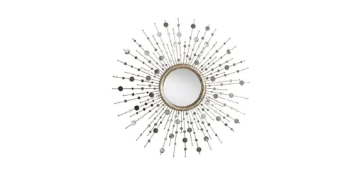 Inspired by the mid-century starburst but with more sparkle and drama our silver-toned Soleil literally lights up a room. It's scaled up and dimensional, a bold work of art. Studded with brushed, silvery discs, rays of varying lengths reach out from the round mirror in the middle, adding brilliance to any room. This sculptural metal piece wears an aged silver finish.