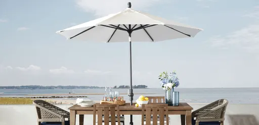 You’ll be made in the shade with our 9-foot patio umbrella. It delivers everything you need to enjoy your time outdoors: vents for excellent airflow and stability; durable extruded, powder-coated aluminum hardware; and a tilting mechanism that lets you tailor your shade where you need it. These Sunbrella patio umbrellas are available in white, taupe, and navy blue, and they're easy to coordinate with any patterns, colors, and styles you love. Umbrella stand sold separately.