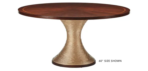 A striking round dining table inspired by neoclassical sculptures and woodworking. Tabletop crafted from Indonesian mahogany. Cathedral walnut random-reverse veneers applied to the top by hand creates a sunburst pattern. Hand-placed primavera inlay around the tabletop's edge. Resin pedestal hand-cast from a hand-carved mold, then finished in Satin Gold (10G); Indonesian mahogany base. 60” dining table seats up to 4; 72” dining table seats up to 6.