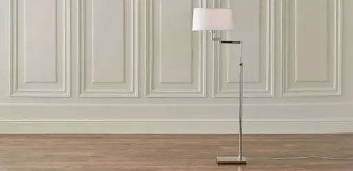 The Tiberius floor lamp's crisp lines and drum shade fit right in with modern and transitional spaces. Its thin linear base slides under a sofa or armchair, and its angular, adjustable arm makes it the perfect companion for evening reading.