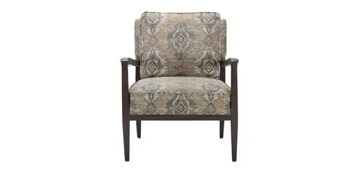 A sleek lounge chair with an exposed wood frame, modern tapered legs, and curved arms. Tailored by hand over a durable solid hardwood frame with engineered panels. Poly-wrapped foam cushions provide a soft, structured seat. Exposed wood shown in Woodcliff Select (955) a cool, deep brown water-based finish. Also available in leather. Also available as a dining armchair and dining side chair. We offer our most popular options online. To view every available fabric and custom option, visit a Design Center. Hand-tailored in North America by Ethan Allen artisans.