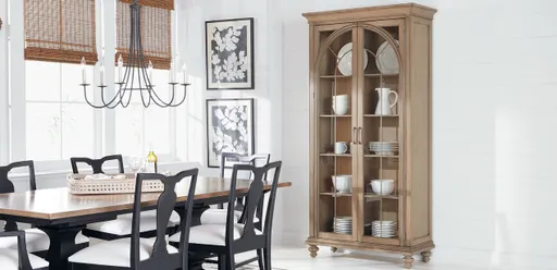 Our Zeta display cabinet is inspired by vintage window shapes and crafted with layers of molding, with curved arches that highlight its display doors. Inset pilaster carving and bun feet add even more vintage-inspired notes; tempered glass doors and internal LED lighting allow your collectibles to take center stage.