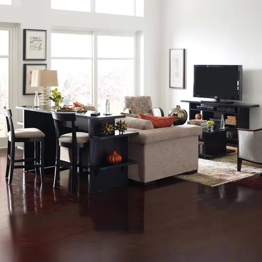 This imaginative piece can be placed along a sofa back, providing storage and a place to set and serve food and drinks, or can be used with our counter stools as an alternate seating area. Wire access through the top. Power strip with USB connection.
