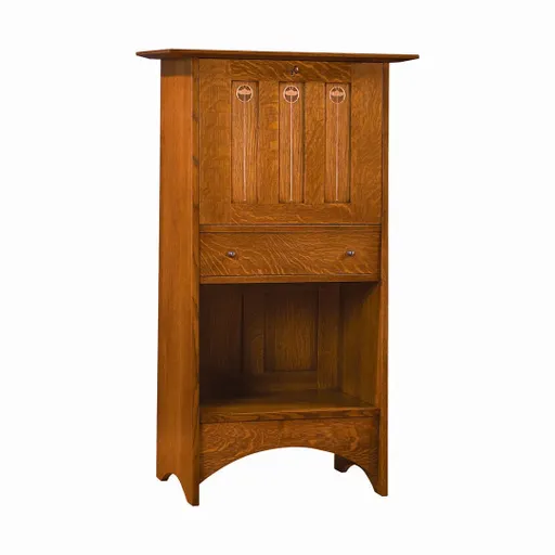 Graceful inlays line the front of this Harvey Ellis Organizer, crafted in classic Mission style. Scaled for modern use to hold a laptop computer when the locking front lid is open, the interior space conceals wire access to the work area along with four cubby holes. Two drawers allow for organizing.