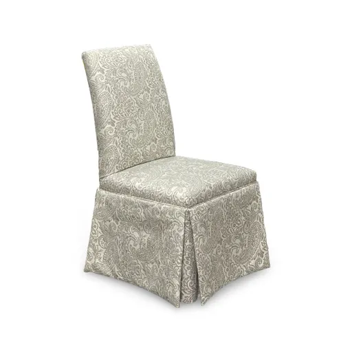 The Hazel Dining Chair brings a fresh twist to classic farmhouse charm with its soft paisley print in sage green and white. The fully upholstered silhouette is elevated by a tailored kick pleat skirt that’s designed as a host chair for your dining room but versatile enough to work as an accent piece paired with a stylish side table. Crafted in the USA with a durable hardwood frame and high-density cushioning, this dining chair is built for lasting comfort and everyday use. Its performance fabric is family-friendly, making it a smart pick for busy homes that don’t want to compromise on aesthetics. Rated at a “Better” quality level, the Hazel Dining Chair is a welcoming and timeless addition to your space. Custom Order Options: - Over 700 Fabric Options To Choose From