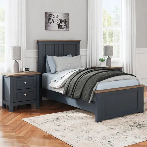 The Landocken Bed combines timeless design with a refined two-tone finish, creating a stunning focal point for your bedroom. The slate blue body is perfectly accented by a light brown wood-tone top, offering a sophisticated contrast that complements both classic and contemporary spaces. Its clean lines and panel-style construction embody classic design, making it a versatile choice for any decor. Rated at a “Good” quality level, the Landocken Bed delivers style and charm to your space. Includes: - Headboard - Footboard - Rails Highlights ★ Panel Style Bed ★ Available in Twin, Full, or Queen ★ Two Tone Finish ★ Finish: Blue ★ Style: Enduring Elegance ★ Material: Hardwood Solids, Mindi Wood Veneer And Mdf Substrates Note - Assembly Required - Professional Assembly provided with in-home delivery - Requires Mattress and Box Spring Foundation. Each Sold Separately. Dimensions TWIN:-