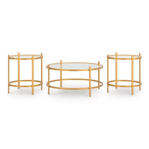 Elevate your living room with the Pearlox Table Trio, a stylish and budget-friendly set designed to pull your space together with ease. This 3 piece set includes one round coffee table and two matching end tables, each featuring a tubular steel frame with an inset tempered glass top. The metallic goldtone powder-coated finish adds a luxurious touch while keeping the overall look light and airy. Found in our Outlet locations and rated at a “Good” quality level, the Pearlox Table Trio delivers a coordinated and refreshing look.