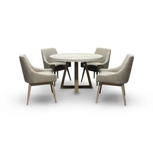Discover the Rowan Dining Set, a chic and inviting space for dining and conversation. The dining table features a striking two-tone finish, with a lighter-toned tabletop that beautifully contrasts against its bold geometric legs. Wire-brushed detailing enhances the natural texture of the wood, adding depth to its sleek gray finish. Complementing the table, the dining chairs offer a stylish yet comfortable touch with their gray upholstered seats, low backs, and sculptural hairpin-style wood legs. Rated at a “Better” quality level, the Rowan Dining Set offers a stylish, cohesive design.