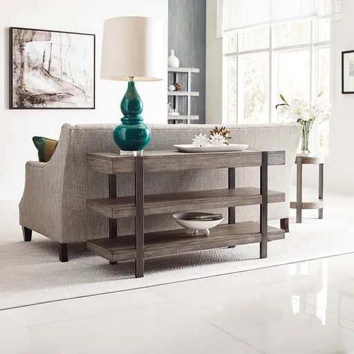 The Sandler Console Table brings modern edge and versatile function to your entryway, hallway, or living space. Its rectangular silhouette is finished in a cool gray tone and accented with sleek metal detailing, giving it an urban-inspired look that stands out without overwhelming the room. Built from acacia and select hardwoods, this piece includes two fixed wood shelves—ideal for displaying books, décor, or everyday essentials with style. The open design adds an airy feel, making it a great solution for both narrow and open spaces. Rated at a “Better” quality level, the Sandler Table Collection is a smart and stylish choice for everyday living.