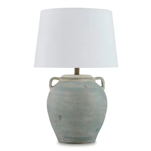 The Shawburg Table Lamp brings relaxed refinement to your space with its vintage-inspired design and country chic charm. Its smooth terracotta base in a greenish-blue hue has the look of a well-loved antique, complete with subtle distressing and decorative side handles that evoke classic pottery. Topped with a crisp white linen shade, this lamp offers a fresh contrast that enhances its nostalgic character. Rated at a “Good” quality level, the Shawburg Table Lamp is an effortless way to elevate everyday lighting with personality and charm.