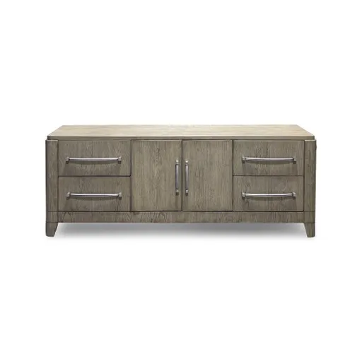 With its sleek form and thoughtfully crafted details, the Southerland Point Console is a purposeful addition to any living room. At 72 inches wide, it offers ample space for your TV display while four drawers and a central cabinet with adjustable shelves provide flexible storage for electronics, media, and more. Built-in wire management keeps cords organized and out of sight, maintaining a clean, streamlined look. Finished in a light gray and accented with exclusive hardware, this TV console showcases rounded corners, oversized pull handles, and tapered legs that give it a modern appeal. Rated at a “Better” quality level, the Southerland Point Console is a stylish piece that keeps entertainment setup organized.