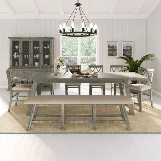 Room to gather all of your family and friends, the new Telluride Driftwood Counter Table Set, is the epitome of Country Rustic Style with it's durable construction. Made of pine solids and veneers and highlighting the character of it's natural distressing, this collection is a bold statement piece in your home.