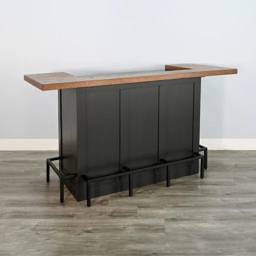 Bring refined character and convenience to your entertaining space with the Uptown Bar. This bar-height piece showcases a striking two-tone look, pairing a wire-brushed brown top with a sleek black base. Perfect for hosting, it comfortably seats up to four and keeps everything organized with spacious shelving, a wine glass storage rack, and two deep drawers. The integrated footrest bar enhances comfort, making long gatherings feel effortless. Rated at a “Better” quality level, the Uptown Bar makes a bold yet welcoming statement in any room.