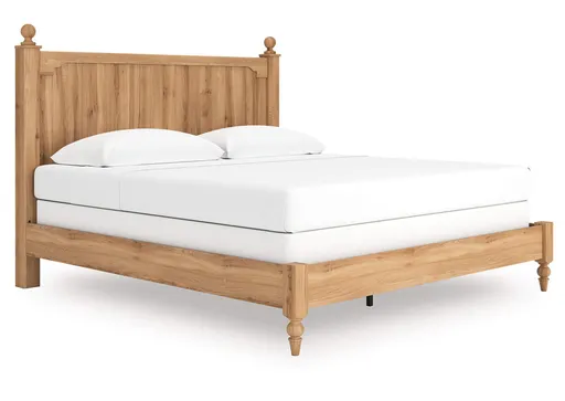 Country rustic. Vintage inspired. However you see it, you’re sure to be charmed by this king panel bed and its relaxed mix of picturesque aesthetics. A gracefully shaped rail brings dimension to the headboard, while decorative ball tops and turned legs adorn the silhouette in quaint fashion. A warm oak grain finish enhances the bed's air of easygoing elegance, letting you drift away to a simpler time and place.