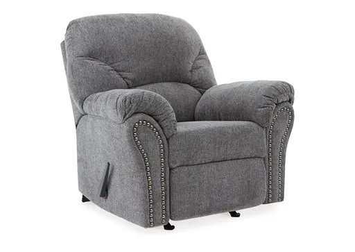 Why sacrifice comfort for style (or style for comfort) when you can have the best of both in the Allmaxx rocker recliner in pewter gray. Elements include a chic divided-back design and pillow top wrapped armrests that make nodding off all too easy. Calling attention to the elegantly flared armrests—black nickel nailhead trim for a punch of cool character.
