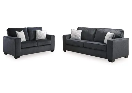 If style is the question, then the Altari sofa and loveseat set is the answer. Sporting clean lines and sleek track arms, the decidedly contemporary profile is enhanced with plump cushioning and a chenille-feel upholstery that's so pleasing to the touch. Sure to play well with so many color schemes, this sofa and loveseat set in slate gray includes understated floral pattern pillows for fashionably fresh appeal.