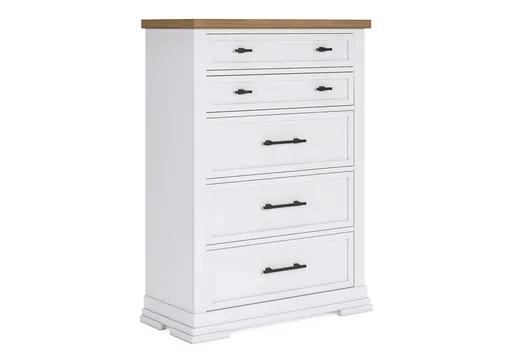 Casual style with substance. The two-tone Ashbryn chest of drawers raises the bar on comfortably cozy design in your soothing sanctuary. A sturdy silhouette with a classic white finish and black metal hardware exudes modern farmhouse vibes. The butcher block oak veneer top adds a relaxed aesthetic. And this charmingly curated piece is spacious enough for all your essentials.