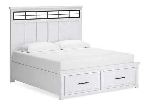 The Ashbryn king panel storage bed delivers casual style with substance. An inset metal detail on the headboard displays a unique take on modern farmhouse design. The bed's sturdy silhouette, classic white finish and black pulls exude a comfortably cozy vibe in your soothing sanctuary. Storage drawers are spacious enough for all your essentials.